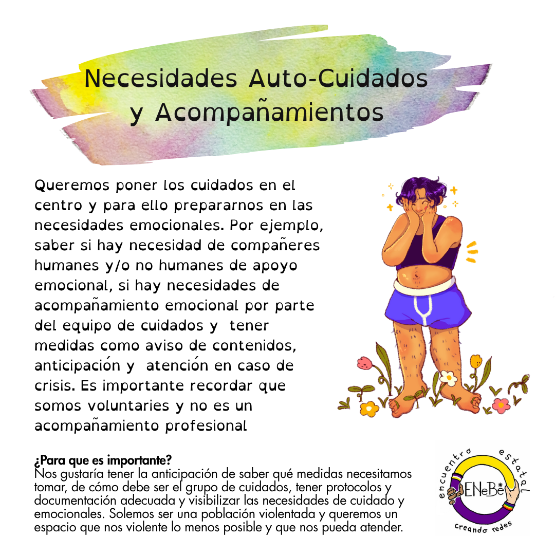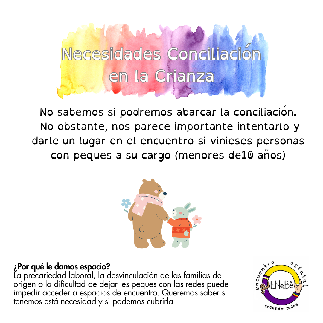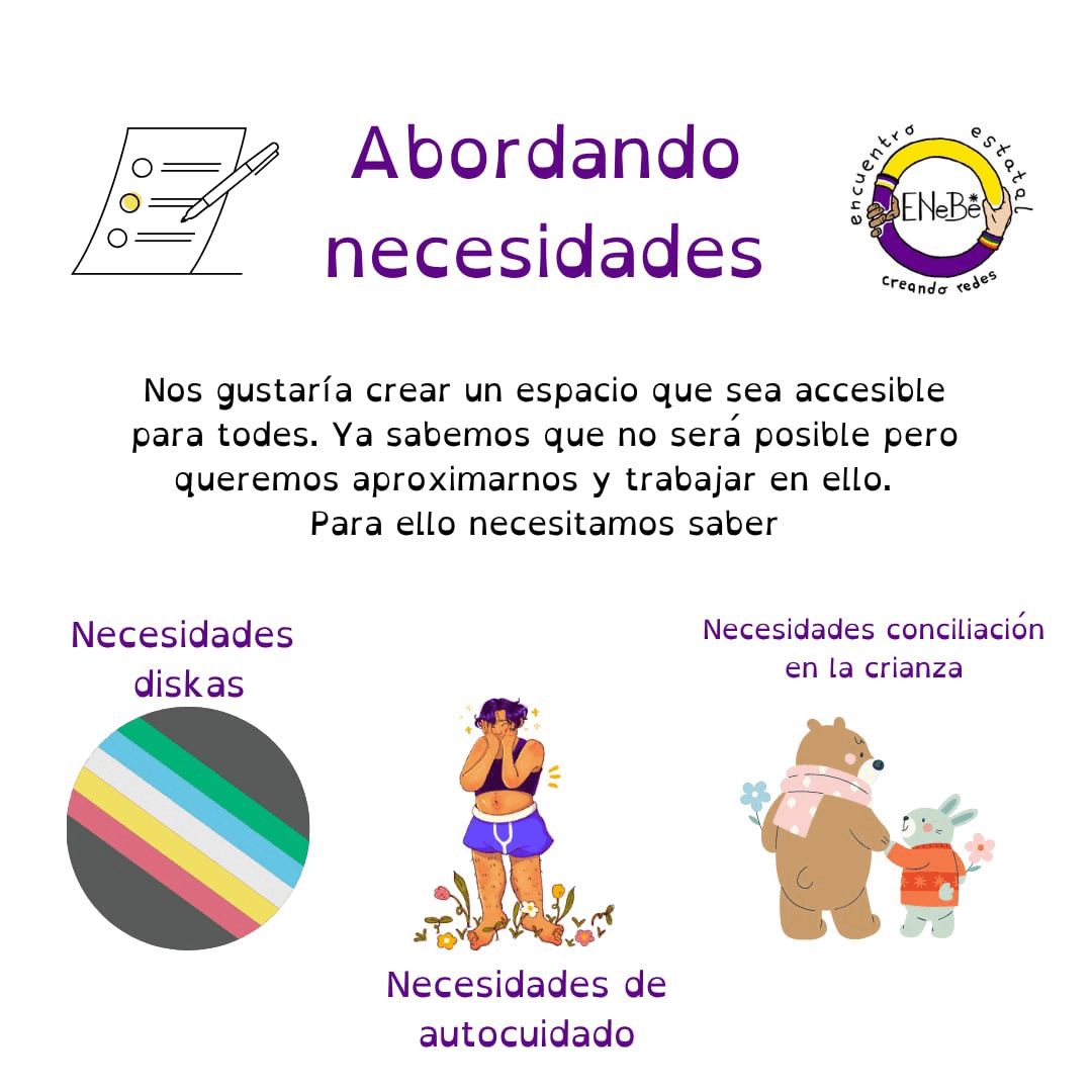 Para construir este Encuentro queremos saber que necesidades podemos y no cubrir, y para ello queremos sondear qué necesidades tiene las personas enebé. Sabemos que, aunque queremos construir un espacio accesible para todes , esto seguramente no sea posible. No obstante, queremos aproximarnos y trabajar en ello. Nos gustaría conocer las necesidades diska, de autocuidado y acompañamiento y las necesidades de conciliación familiar.