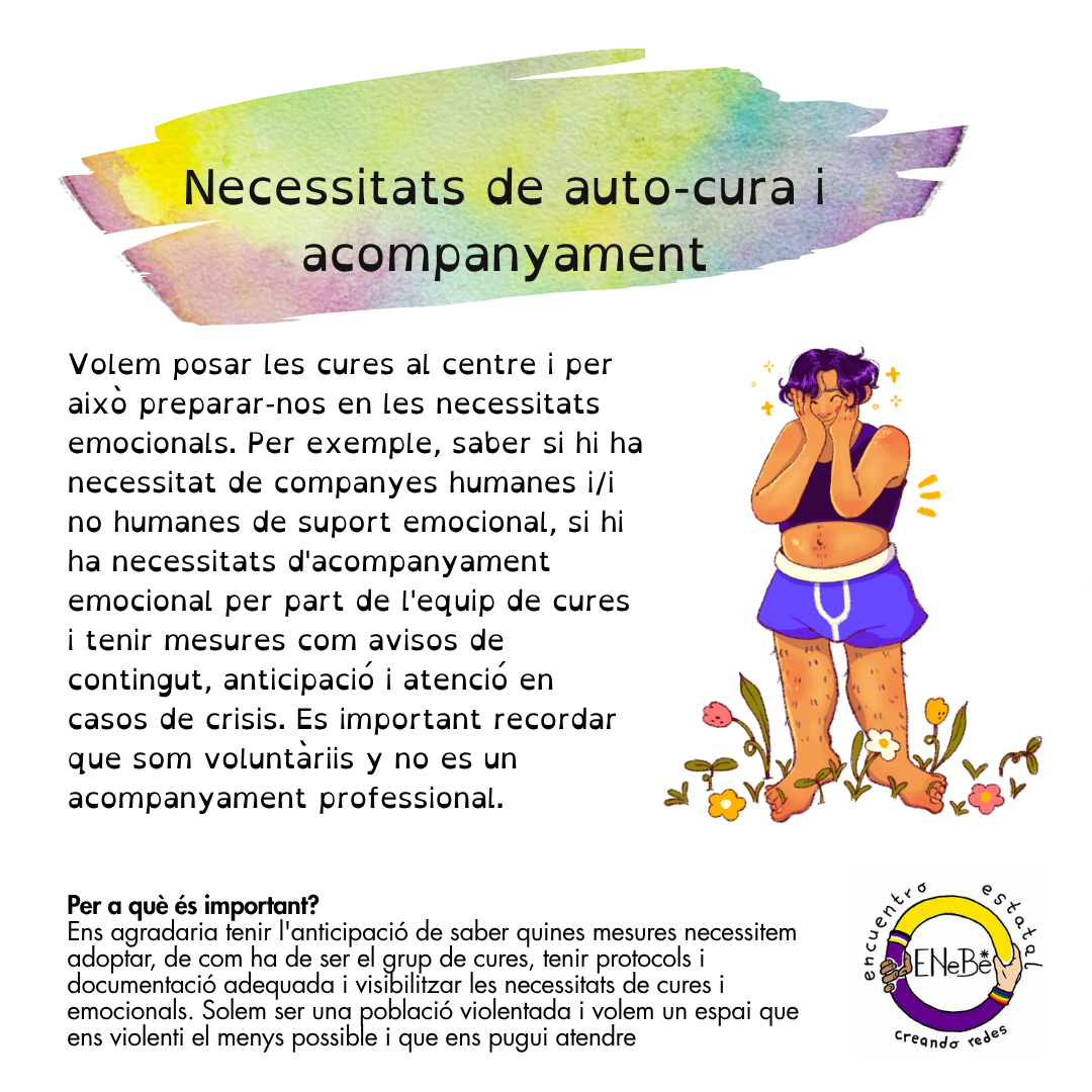 Per construir aquesta trobada volem saber quines necessitats podem o no cobrir, i per això volem sondejar qui és necessitats tenen les persones no binàries. Sabem que, encara que volem construir un espai accessible per totis, això segurament no serà possible. No obstant, volem aproximar-nos i treballar-ho. Ens agradaria conèixer les necessitats fiska, d'autocures i d'acompanyament i les necessitats de conciliació familiar.