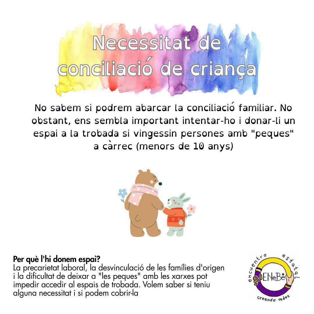 No sabem si abarcar la conciliació familiar. No obstant, ens sembla important intentar-ho i donar-li un espai a la trobada si vingessin persones amb "peques" a càrrec (menors de 10 anys).