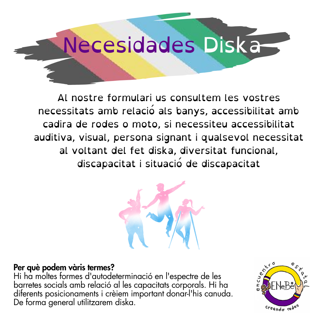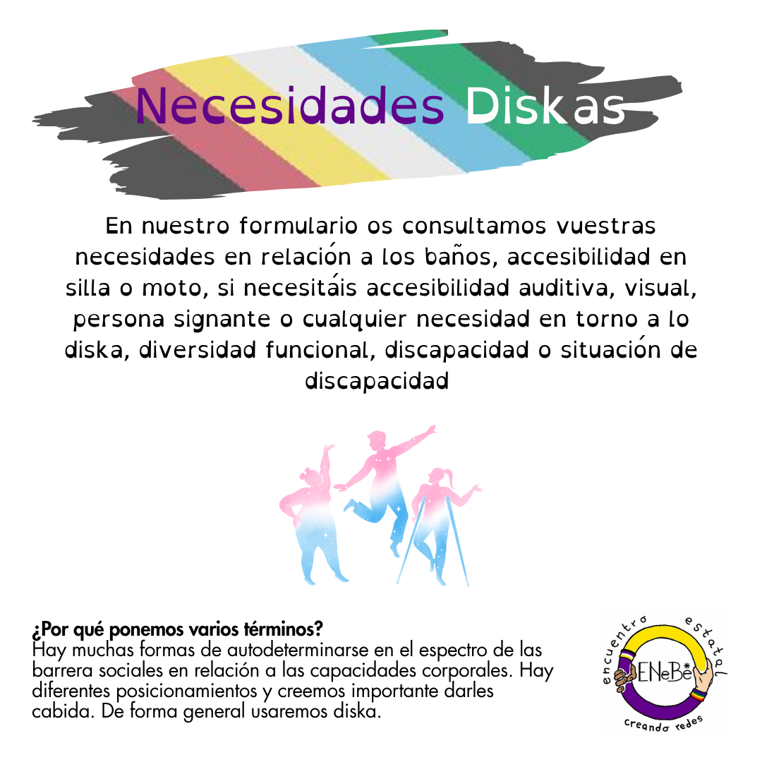 En el cuestionario preguntamos por las necesidades diska. Queremos saber vuestras necesidades en tanto a los baños, la accesibilidad en silla o moto, si necesitáis accesibilidad auditiva, visual, persona signante o cualquier necesidad en torno a lo diska, diversidad funcional, discapacidad o situación de discapacidad.