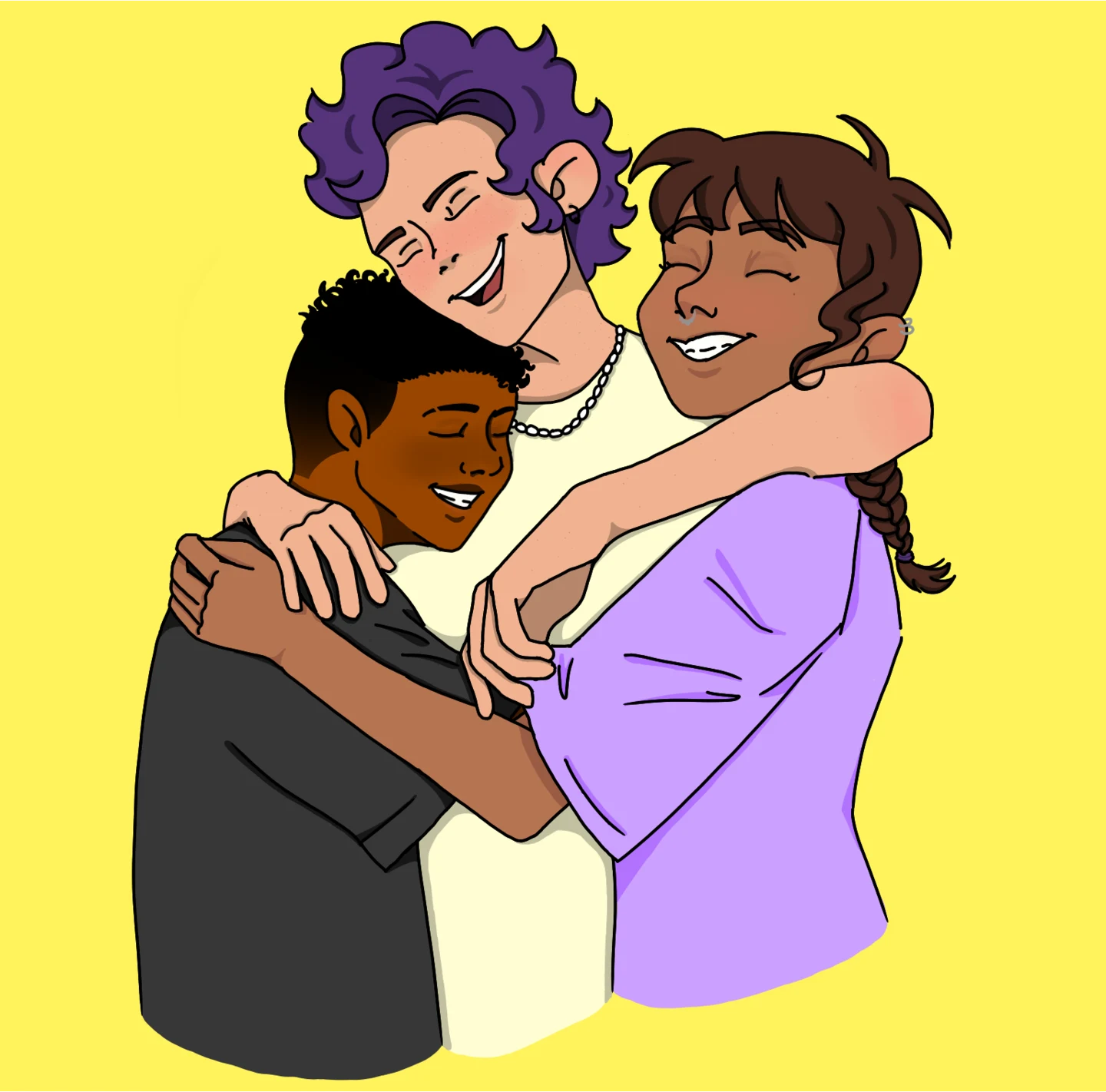 “Tres personas abrazándose como símbolo de la creación de redes de cuidados entre personas enebé, la paleta de colores se basa en la bandera no binaria y son personas diversas para representar la diversidad e interseccionalidad del colectivo enebé”