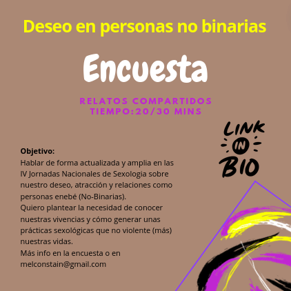 Quiero hablar sobre nuestro deseo, atracción y relaciones como personas enebé (No-Binarias) residentes en España con independencia del lugar de origen. También plantear la necesidad de conocer nuestras vivencias y cómo generar unas prácticas sexológicas que no violente (más) nuestras vivencias.