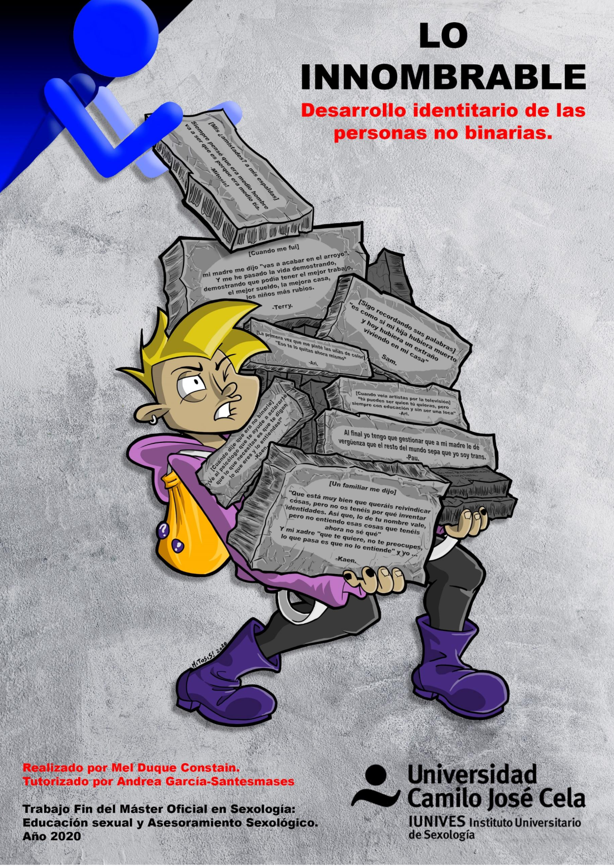Esto es el trabajo fin de master de Mel Constain, que "pretende explorar, visibilizar y analizar las vivencias durante el desarrollo evolutivo en el contexto español. Es un estudio exploratorio con una muestra de 16 personas no binarias seleccionadas por estratificación intencional por conveniencia y por bola de nieve. Se emplean relatos de vida, la Escala de Ansiedad y Depresión de Goldberg, la Escala de Autoestima Corporal de Peris y una Encuesta sociodemográfica. El análisis se realiza mediante análisis temático y estadístico, y empleando el conocimiento situado, la reflexividad y el cuidado.
